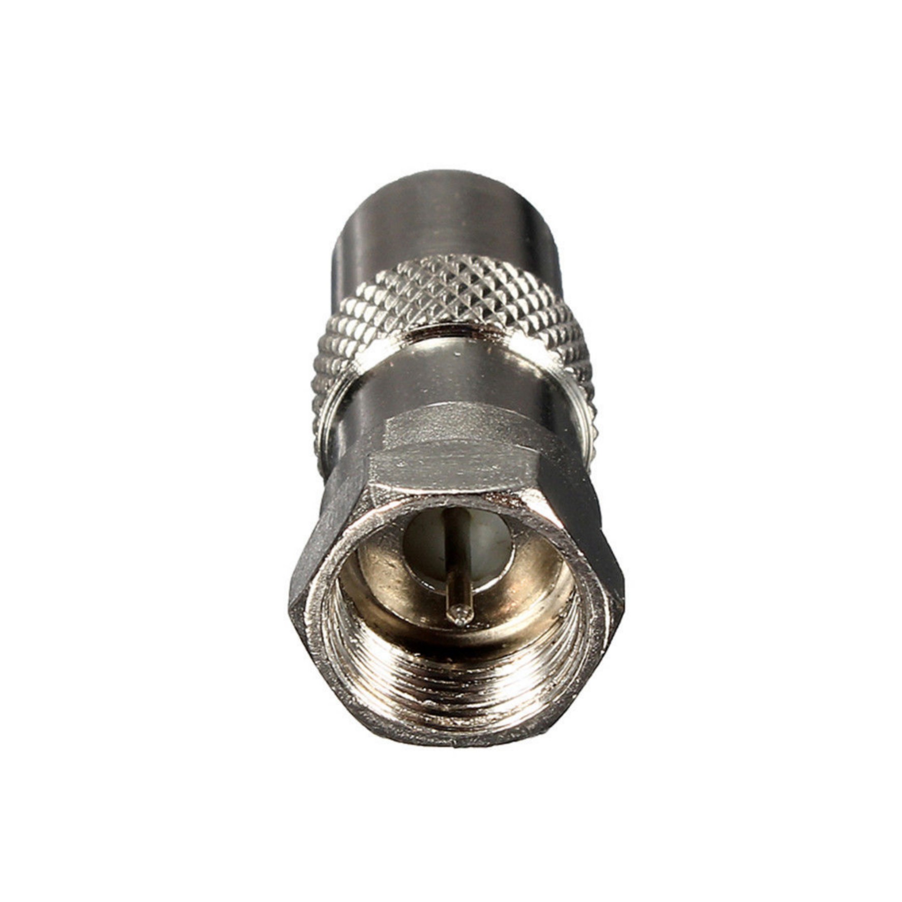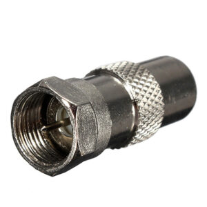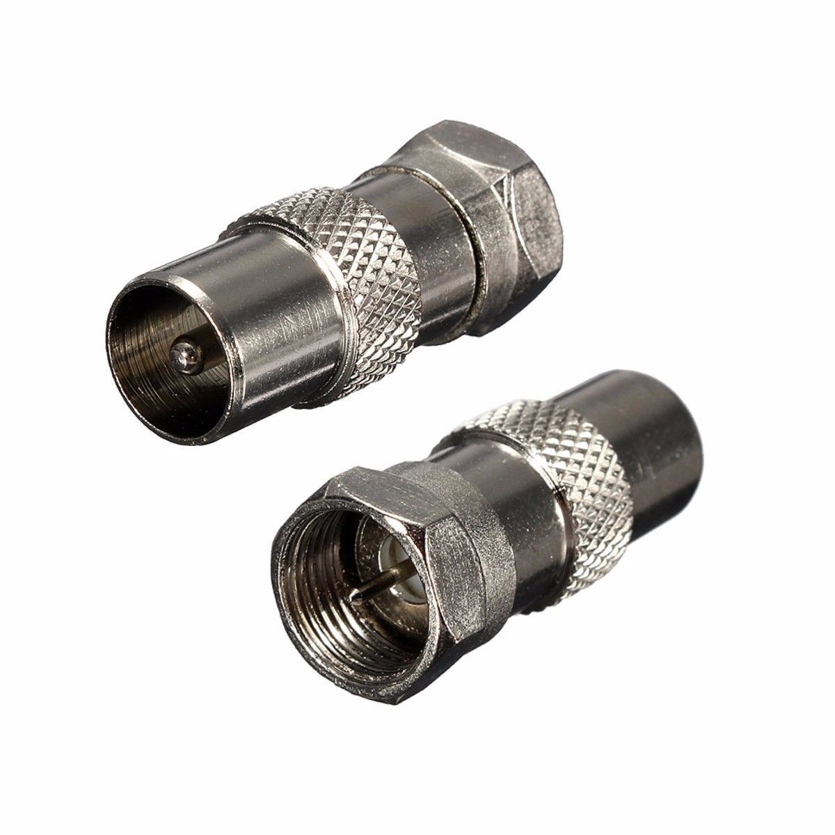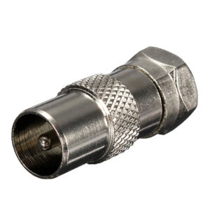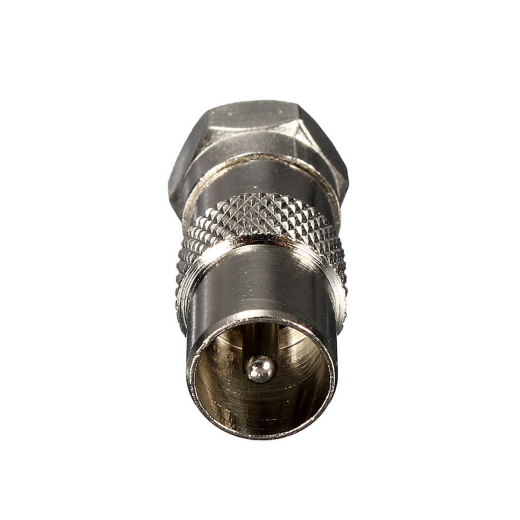 Converts a standard F-type male coaxial connector (common for satellite/cable) to a PAL (Belling-Lee) male TV aerial plug used in many regions.