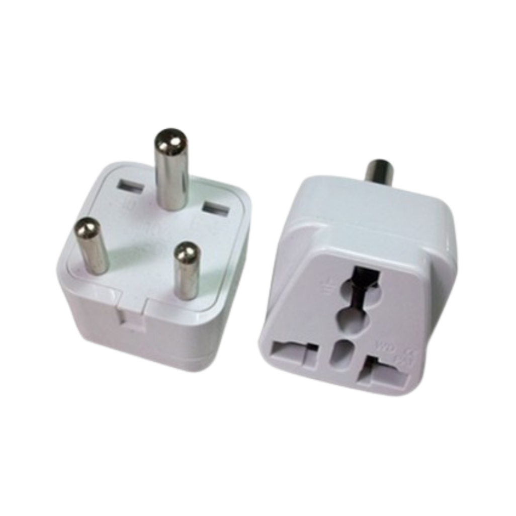 Compact international travel adapter that accepts a standard IEC Type M (South African SABS 164-3) 3-pin plug and converts it for use with various international wall outlets.