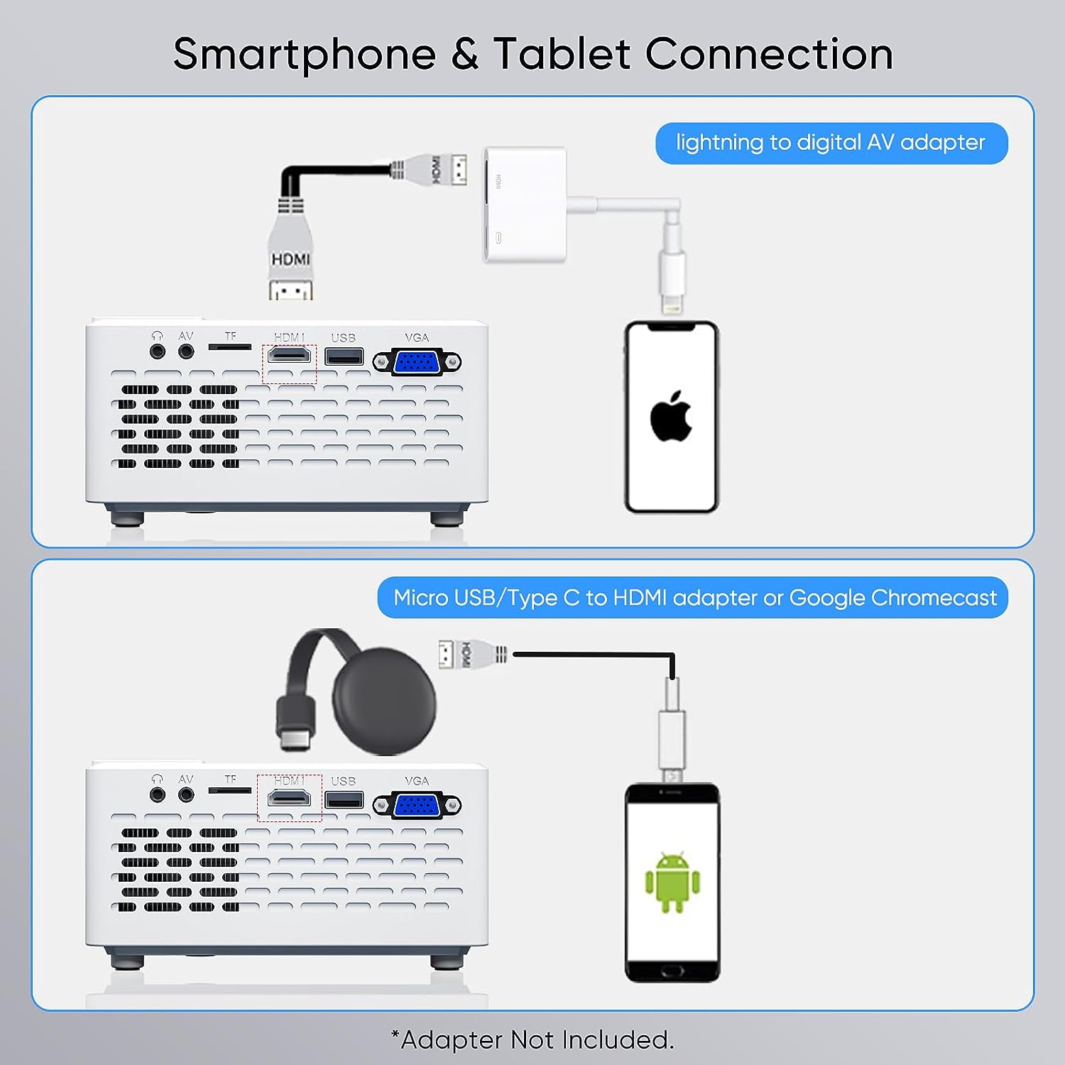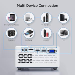 With the built-in HDMI, VGA, AV, USB Headphone port & TF card slot, and included AV & HDMI cable, this projector is the perfect solution for various input sources.